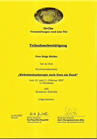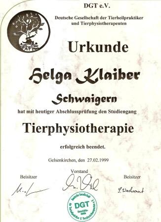 1997 Ausbildung zur Tier - Physiotherapeutin für Hund und Pferd, an der FAT in Gelsenkirchen, die erste Schule in Deutschland, bei der diese Ausbildung möglich war.